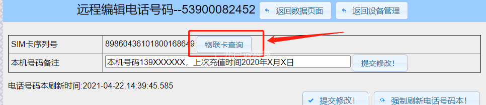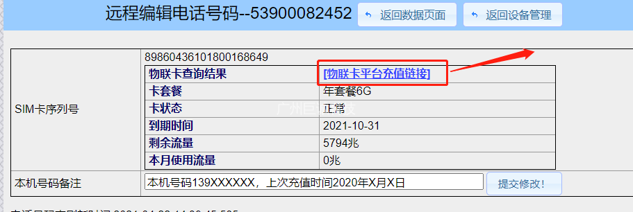 步骤:设备管理---远程编辑电话号码---物联网卡查询---平台充值链接。