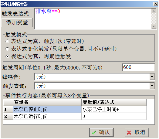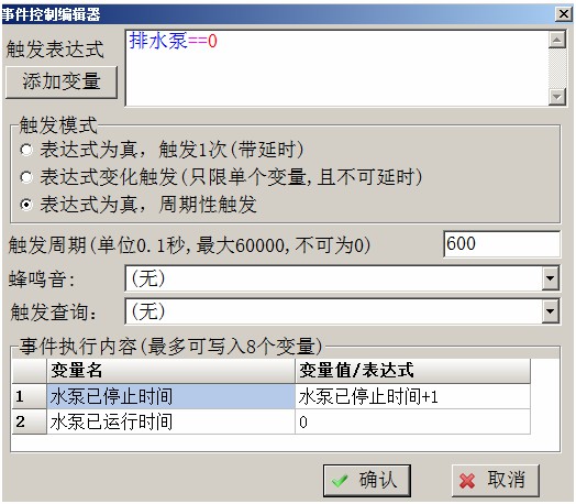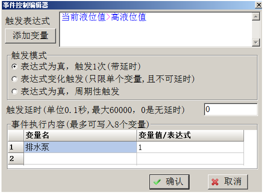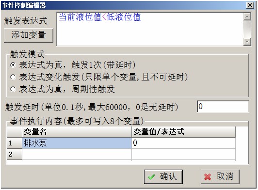 2:在当前水位达到高水位7米时,启动水泵,低于低水位5米时要求停止水泵。水泵直接用GRM200的继电器输出控制。