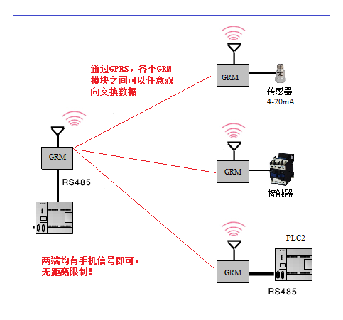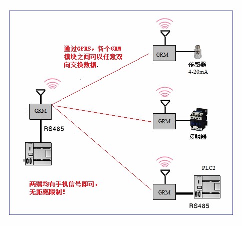 典型应用包括: 远程的传感器数据传给PLC,远程的多个PLC之间交换数据,PLC和远程设备之间联动控制等,如下图(以下的GRM模块必须是G系列的模块,而且需要插入开通GPRS的手机卡):