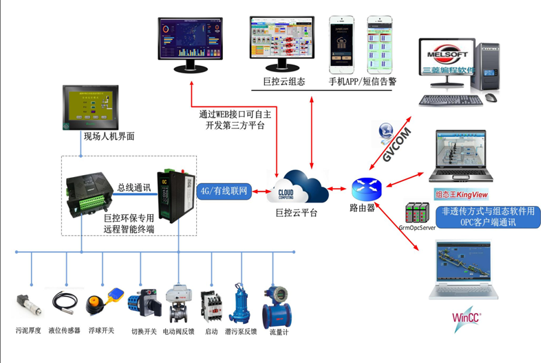 作为工业互联网先锋企业 巨控科技推出针对农村环保水处理行业专用的远程监控解决方案,利用PLC 、4G 全网通网络和云服务,对污水处理站点设备运行参数和状态进行本地可编程逻辑控制、手机短信报警、手机APP 监控,中心远程集中监控,网页远程后台监控。