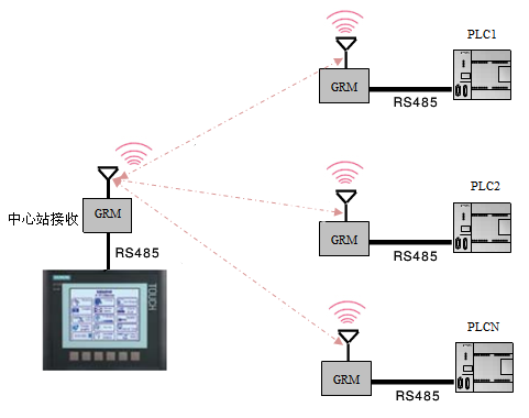 多个 GRM530 模块之间可以直接交换数据,客户无需任何网络知识和搭建服务器,典型应用如下