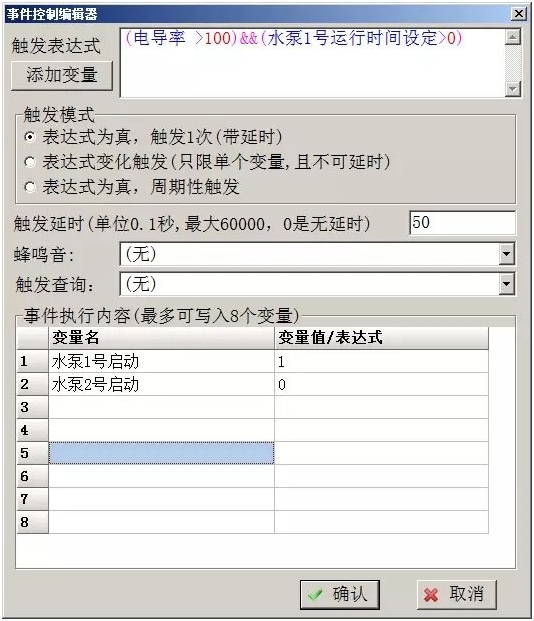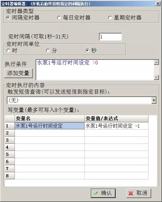 2 、两台水泵轮换工作,水泵运行时间设定,运行间隔设定,工作模式设定等逻辑控制,全部由模块完成。(控制语法示例如下)。