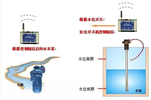 1.水池水位过低时,模块发短信给远程取水点的水泵,远程水泵开启