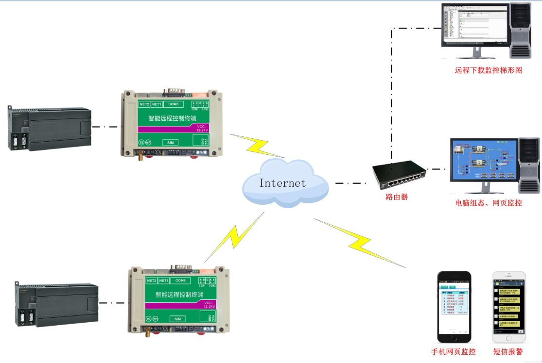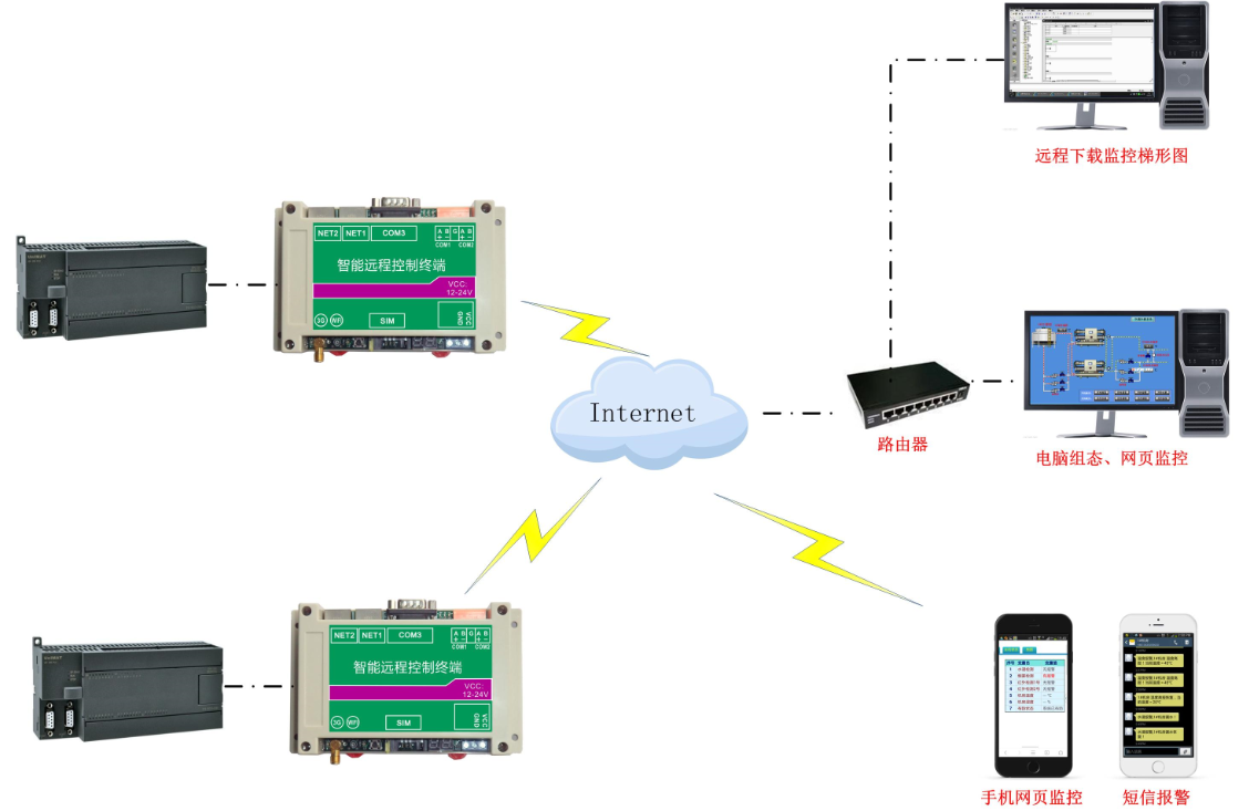 远程测控系统是利用传感器、西门子PLC和泵房远程终端巨控GRM500,泵房现场的数据进行实时采集、处理,通过成熟的4G网络将现场数据上传到控制中心监控组态软件或将控制中心的指令下传到泵房终端单元和执行机构。系统应包含传感器、PLC、泵房远程终端单元GRM500模块、4G通信线路、控制中心、执行机构。