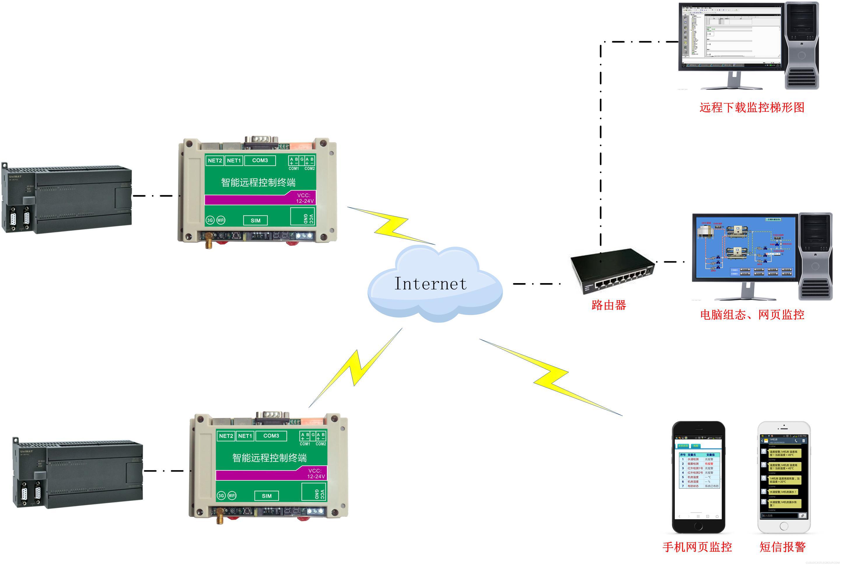 选择二号井泵房值班室作为水源井泵房远程测控监视系统(管控平台)的控制中心。二号井泵房与控制中心相邻,距离较近,可直接与控制中心建立通信连接;四号井、八号井由于距离太远各采用 巨控GRM500 PLC专用无线通讯模块与控制中心建立通信连接,同时,在巨控GRM500远程模块具备短信发送功能,当有事件时,GRM500能够及时发送短信和拨打电话通知相关人员,巨控GRM500还支持移动端手机APP远程监控,随时随地了解现场工作状态。