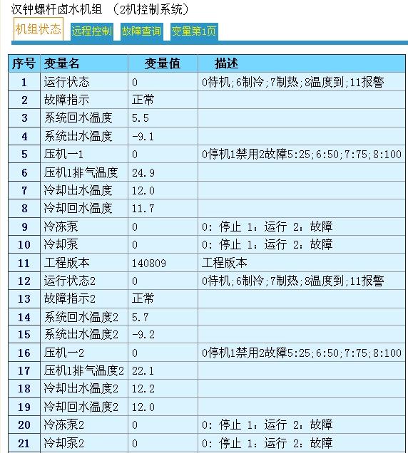(1)电脑能上网,即可通过电脑可以动态效果的形式查看机组的出回水温度,压机电流,水泵运行情况,压机能量级别等信息,在出现故障时,电脑上可以查询空调机组的故障情况。