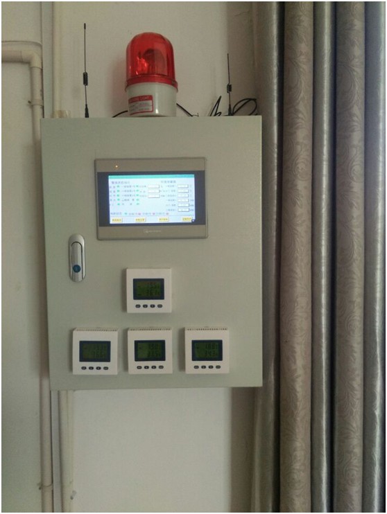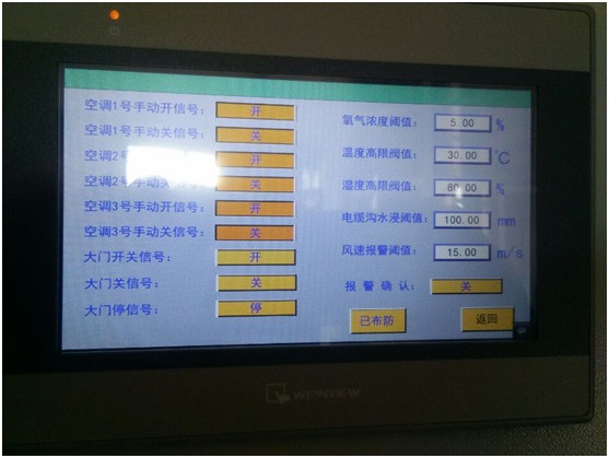 3、现场触摸屏可显示当前警报状态指示、环境测量值、阀限设置、设备手动开停,数据查