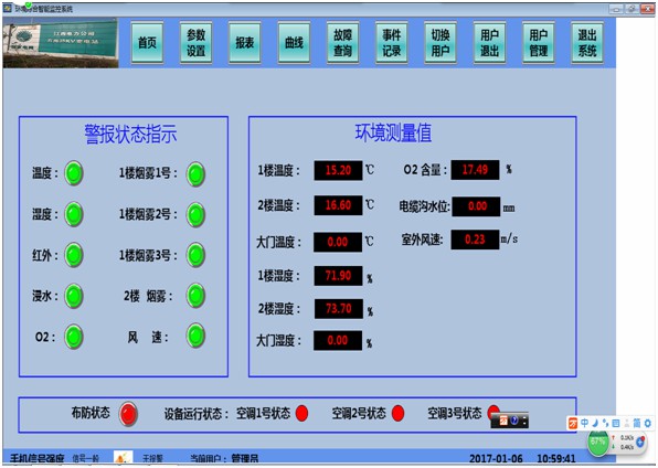 巨控环境综合智能监控系统是利用PLC、GRPS网络和云服务,对机房、变电站运行的重要设备环境参数和状态进行本地或远程联动控制、手机短信报警、远程电脑和网页后台监控。该装置采用工业级专用数据集中控制器,可靠性高且配置灵活等特点,可根据现场需求随时增加功能。现场大屏触摸屏显示方便查看和操作。