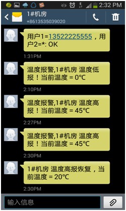 2、用户在发生报警时可以接收到报警短信,如下:2014-07-02 12:34:28 二楼4度库温度高报,当前温度:8.0℃