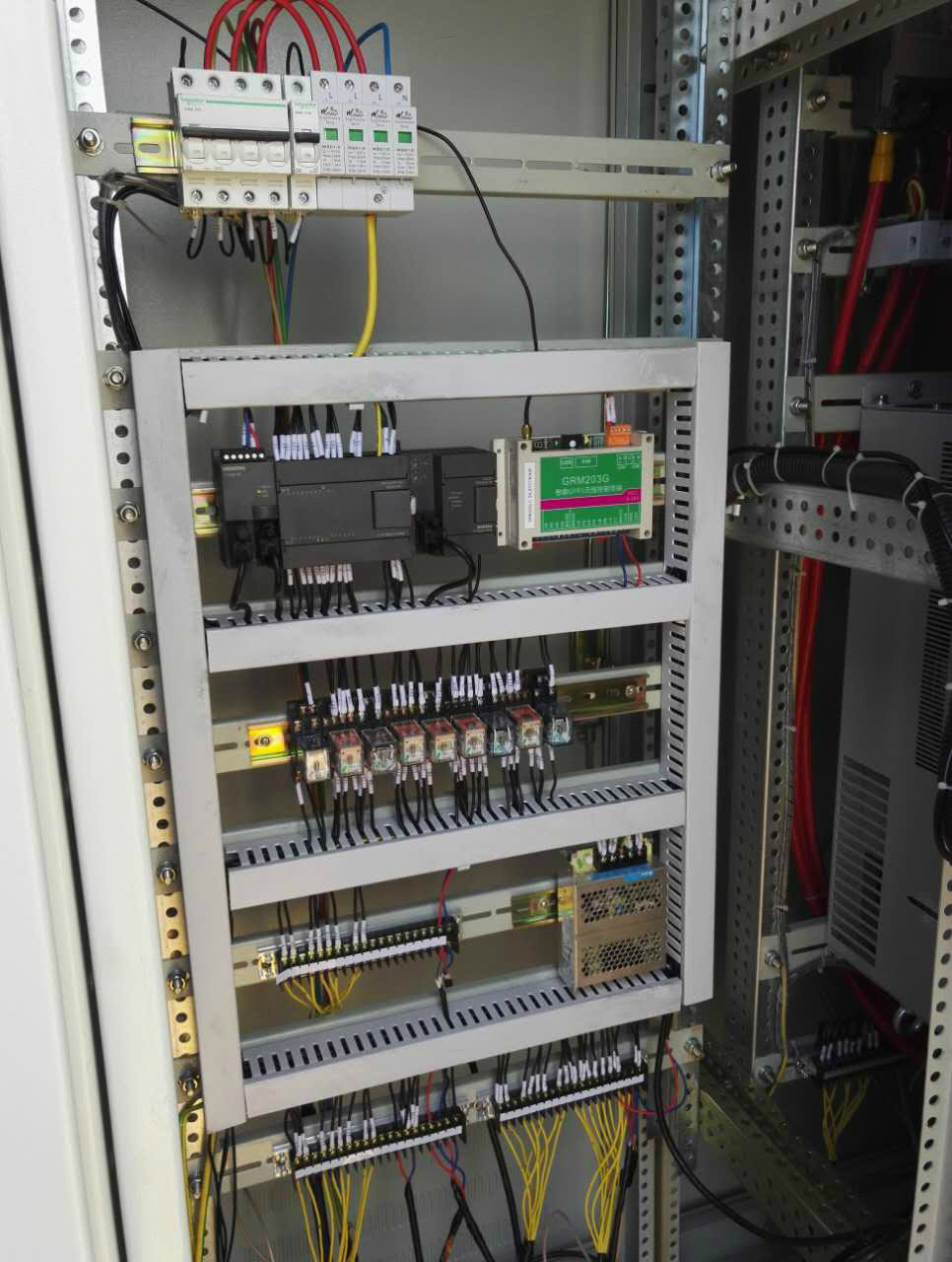1、每一套供水系统加装一个GRM203G-C模块,模块与plc通讯,读写plc寄存器中的数据,实现远端对plc的监控,解决野外布线监控高成本问题;