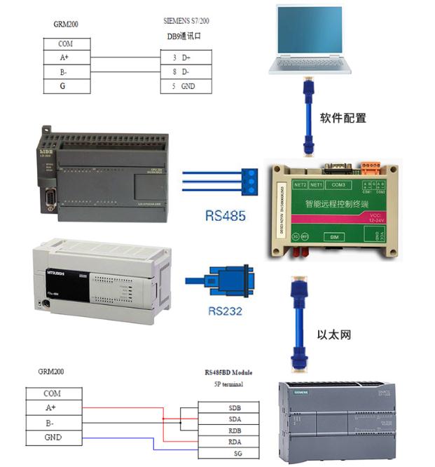 1)设备现场,GRM500无线通讯模块可以用485(232)和PLC连接。如果现场有多个带网口的PLC和触摸屏,可以和GRM500接入同一交换机。GRM500通过4G接入因特网即可远程监控调试全部接入的PLC。