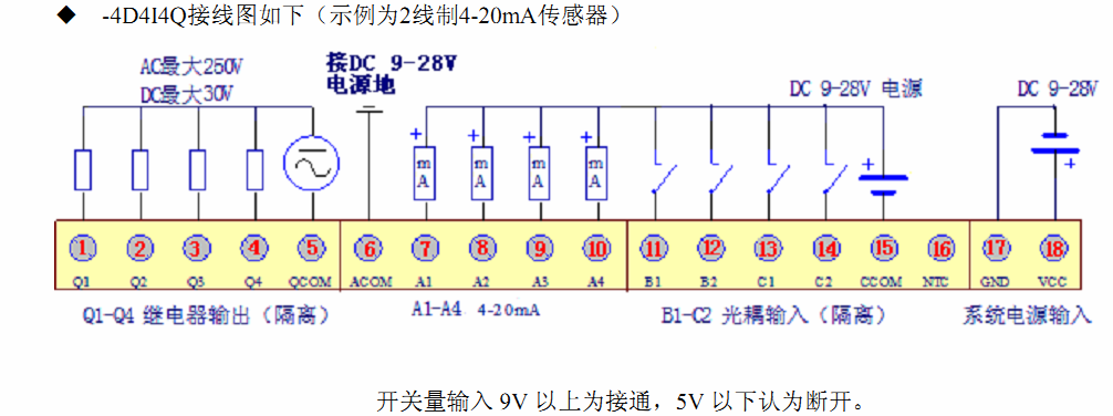 数字输入:最多8路DC 9V-24V(光电隔离)或开关输入