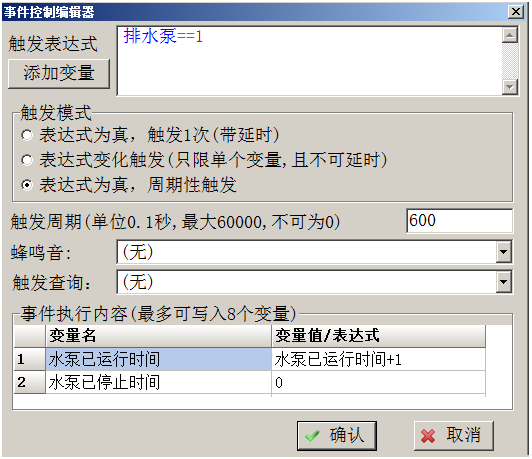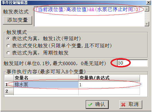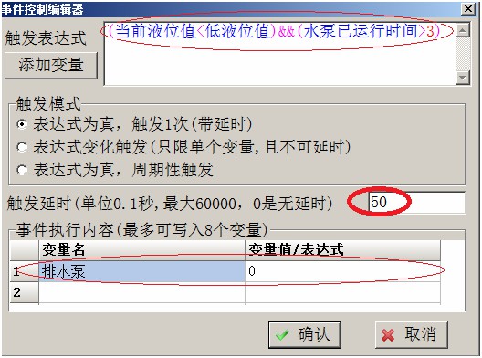 2:在当前水位达到高水位7米时,启动水泵,低于低水位5米时要求停止水泵。水泵直接用GRM200的继电器输出控制。
