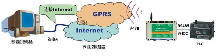 4:将 GRM500和PLC通过 485,232 或PLC以太网接口互联,在远程即可通过PLC编程软件监控梯形图,下载程序,通过组态软件远程监控PLC。支持的PLC 包括西门子,三菱,欧姆龙等通用 PLC , 也支持标准MODBUS协议以及国内外各种控制器协议。