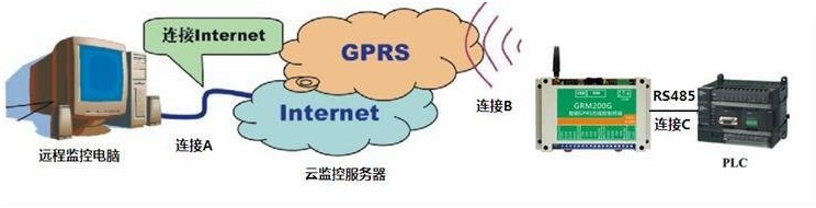 2.连接B: GRM500G通过GPRS/3G/4G/以太网/WIFI到云监控服务器的连接。