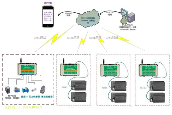 污水处理的控制系统可以采用PLC进行自动控制控制,要实现中控远程监控,只需要将PLC与中控系统的组态连接起来,实现远程通讯既可。PLC的远程通讯采用巨控的 GRM200系列智能GPRS无线控制终端,通过远程控制终端的GPRS网络与巨控的云服务器实现双向通讯。中控组态通过巨控的OPCsever电脑客户端实现和巨控云服务器的双向远程通讯。