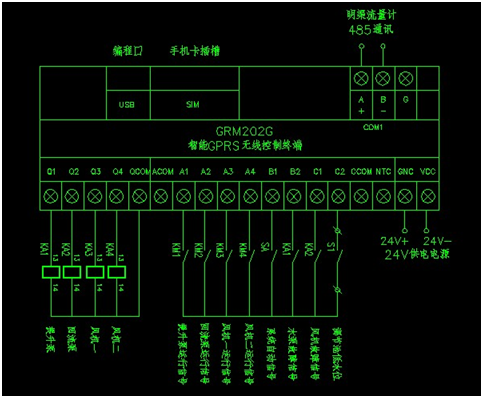 污水处理的控制系统可以直接采用巨控的GRM200系列智能GPRS无线控制终端直接进行运行信号采集,并通过无线控制终端自带逻辑编程功能和继电器输出功能,实现各种泵的运行控制。控制原理可以参考下面的接线图 。