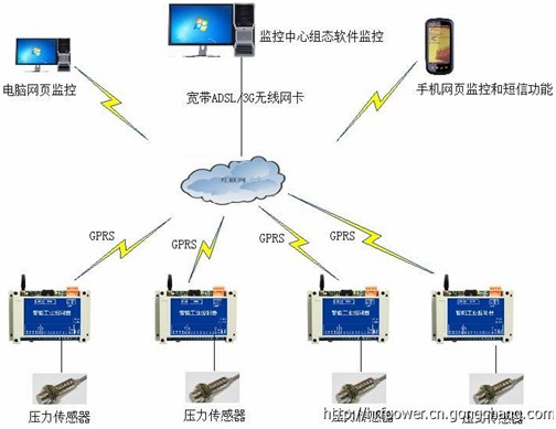 系统中有传感器,输出为模拟量信号,现场增加工业无线控制终端 GRM200G,实现模拟量实时数据的采集,无需配置就可以以GPRS的方式上发到云服务器,可以完成短信报警、短信查询、手机或电脑网页监控等服务。值班人员可以发短信或者拨号查询水泵压力,水泵压力过高或者过低时会自动发短信和打电话通知值班人员,值班人员也可以用手机或电脑网页实时查看现场数据,模块还能定时自动发送短信给值班人员汇报实时压力,一个模块就实现了这些功能,使用方便,由于采用非透传方式流量少,可靠性高。