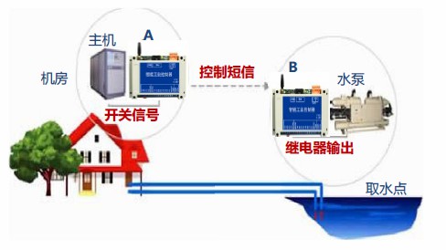 1.水池水位过低时,模块发短信给远程取水点的水泵,远程水泵开启