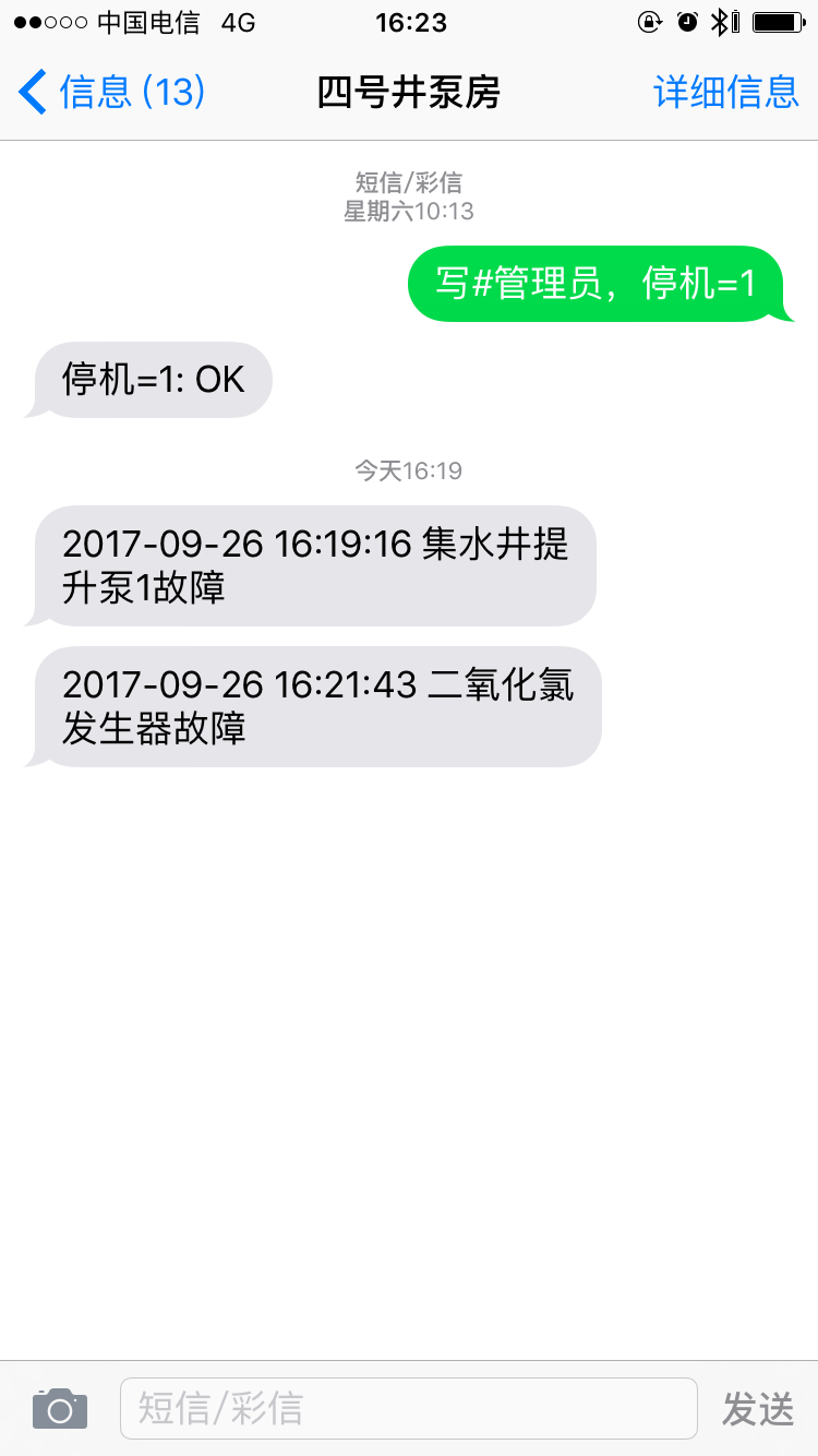 终端单元能够检测电机失压、过压、外壳温度、三相电流平衡、过载、轻载(小于额定负载的30%)。当以上被检测量超过报警值时,泵房的GRM500远程终端单元能够主动向以短信发送警告信息相关人员,同时远程控制中心的组态软件在电脑上弹出警告对话框和发出音响告警,但电机仍可正常运行。警告对话框和GRM500发送的短信内容包含发出警告的地点、警告的内容报警时被检测量的数值和时间。