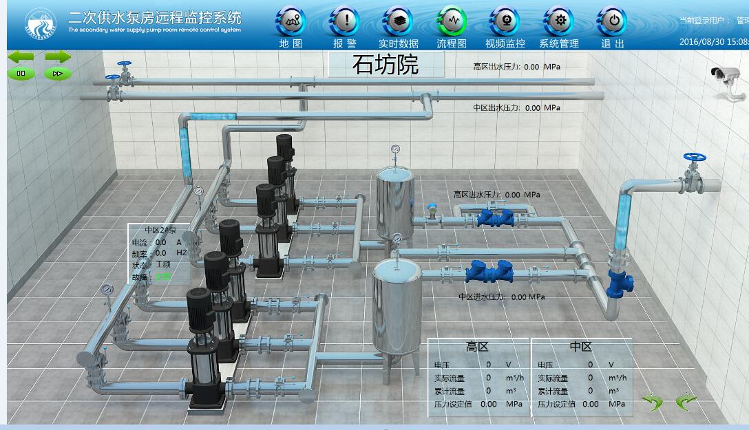 3、系统将每个泵房的供水管道的压力、瞬时流量、累积流量、水井动水位、三相电机的线电压、相电压、相电流、泵房内电机外壳的温度、有功功率、无功功率、有功电量、无功电量、功率因数、开关机时刻、开机运行时间、平均每方水耗电量、有无人闯入和六个泵房累积流量之和、累积有功电量之和、平均每方水耗电量等变化量的实时动态数据生成日、周、月、年曲线图和报表,在曲线图和报表中自动标出最大值和最小值,并建立历史数据信息,存储每天上传的数据,以便日后调阅。