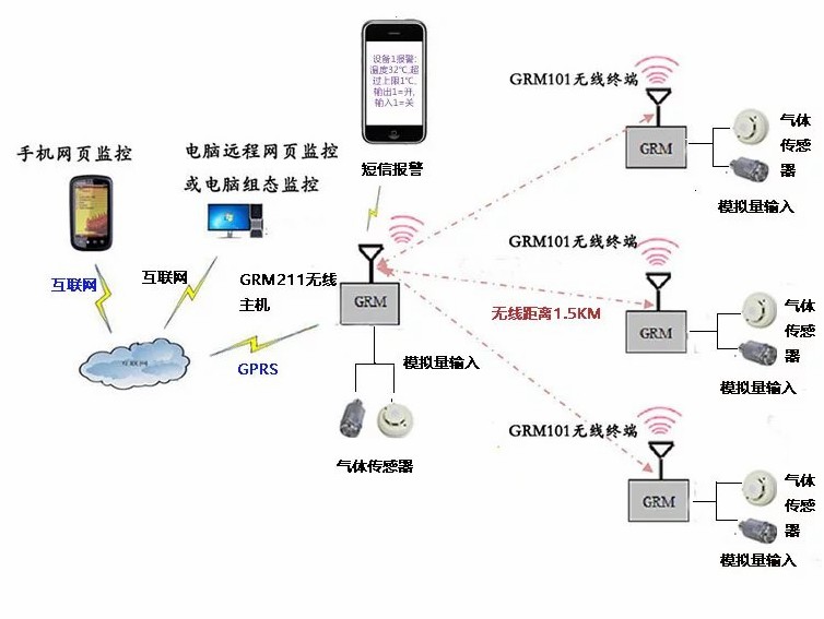制药公司因为生产工艺和安全生产的需要,不同的生产环节分散在多个车间,每个车间又是分散的,各车间距离厂区中心点的距离不超过1Km。每个车间中又有不同的可燃气体的浓度需要测量。加装监控系统时,需尽量不影响生产。项目需要方便实时查看厂房各处可燃气体情况,当气体浓度超过安全限度时需及时报警,通知相关人员马上进行处理,防止发生安全事故。