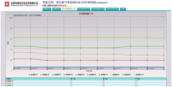 智能无线一氧化碳监测系统:该项目安装34台一氧化碳探测器,量程为0~1000ppm,输出信号为:4~20mA,集中传输接入智能GPRS无线终端,并接入山西安塞科公司生产的气体报警控制系统,可以通过现场触摸屏,电脑网页、手机APP随时随地监测现场气体浓度,并能设置短信分级报警。