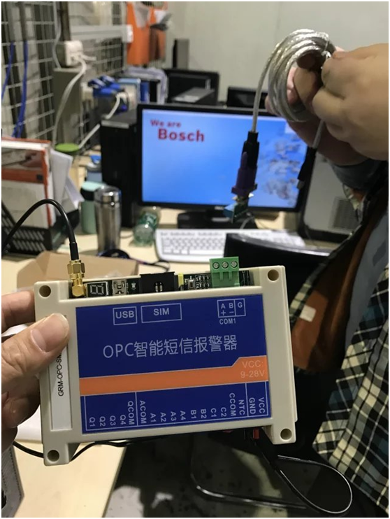 博士(BOSCH)长沙工业园故障报修系统加装 巨控OPC智能短信报警系统,原有系统监控系统为WINCC,巨控智能短信报警通过wincc的opcsever直接调用wincc中的数据信息,进行短信报警,wincc系统不做任何改动,所有增加的短信报警功能都在巨控OPC智能报警系统实现。