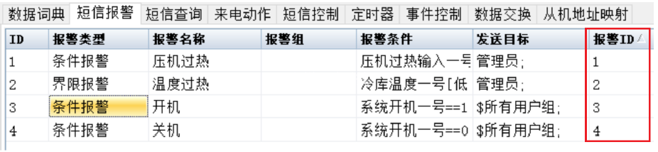 要查询的报警 ID ,对应 GRMDEV 里面短信报警配置中的报警 ID 。如下图,我们希望点击开机记录后查询到开关机,则自定义查询里面,报警 ID 范围设置为 3,4 即可